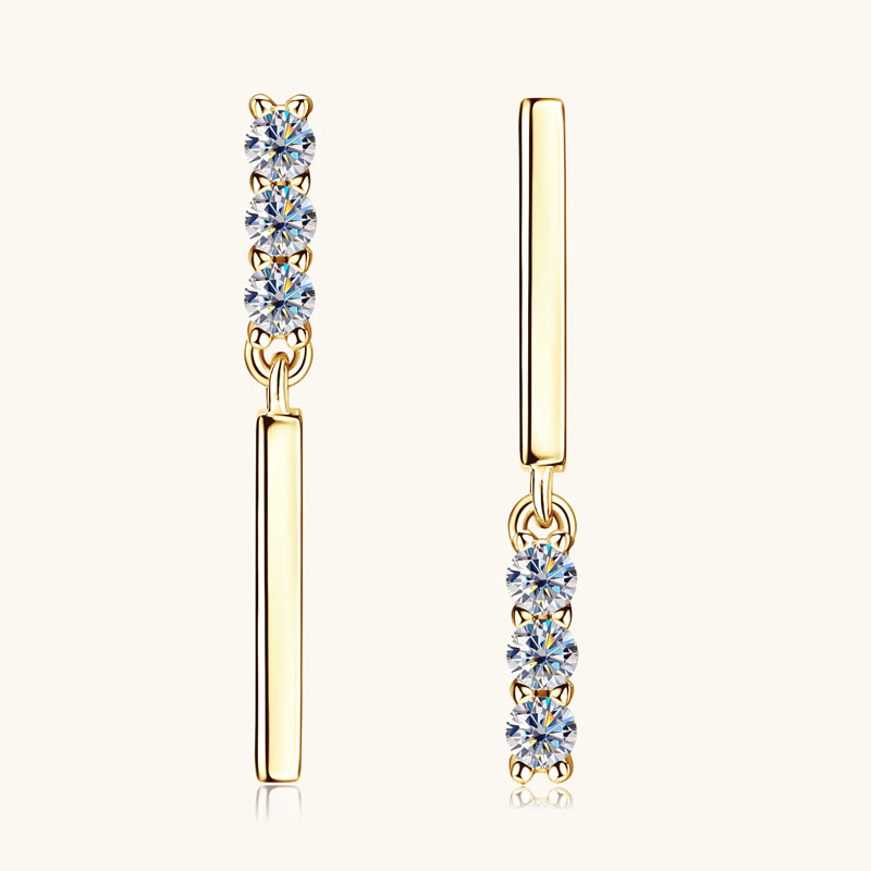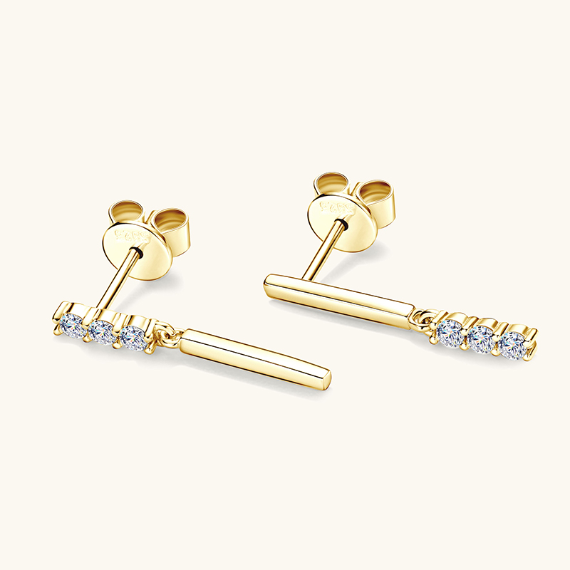 14K aranyozott lógós ezüst fülbevaló – 1.8 karátos Moissanite gyémánt kövekkel Ez az elegáns 14K sárgaarany bevonatú fülbevaló 925-ös sterling ezüstből készült, ragyogó Moissanite gyémánt kövekkel, amelyek kivételes fényükkel a természetes gyémántokhoz hasonló hatást keltenek. A precízen csiszolt kő minden mozdulatnál káprázatosan szikrázik, így egyszerre sugároz luxust és finom eleganciát, de mégis megfizethető.