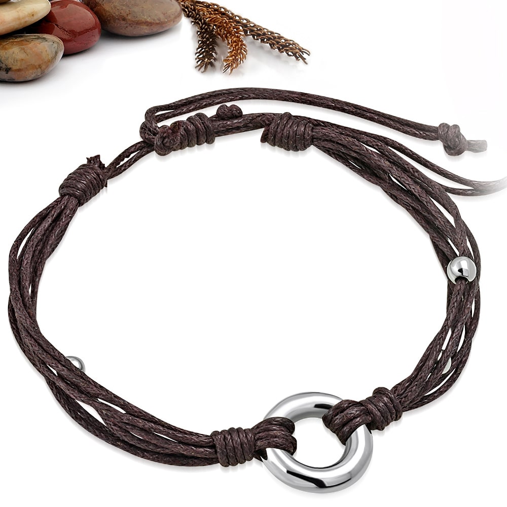 Állítható, divatos, barna színű, több szálas szövet karkötő karika dísszel