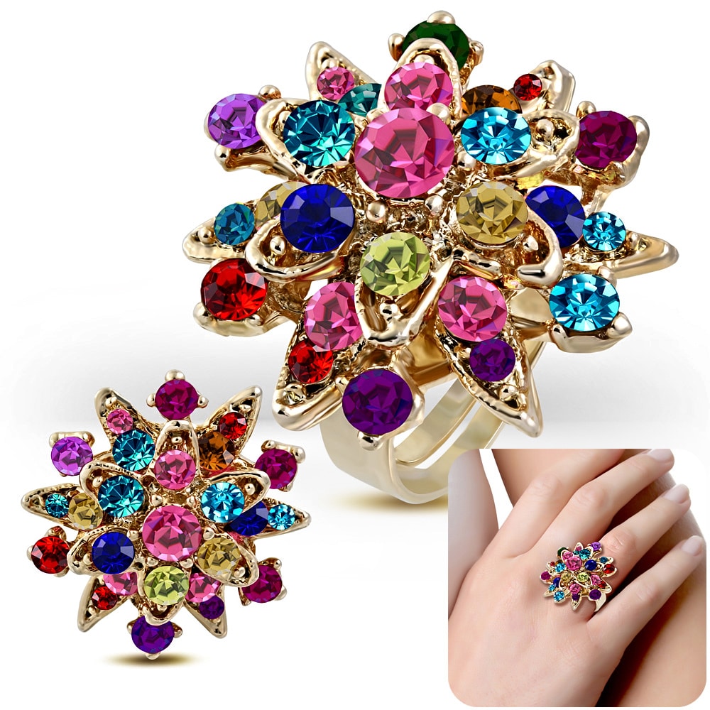 Állítható, virág alakú koktél gyűrű, színes cirkónia kristállyal