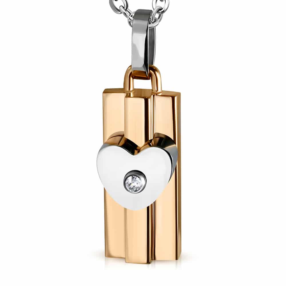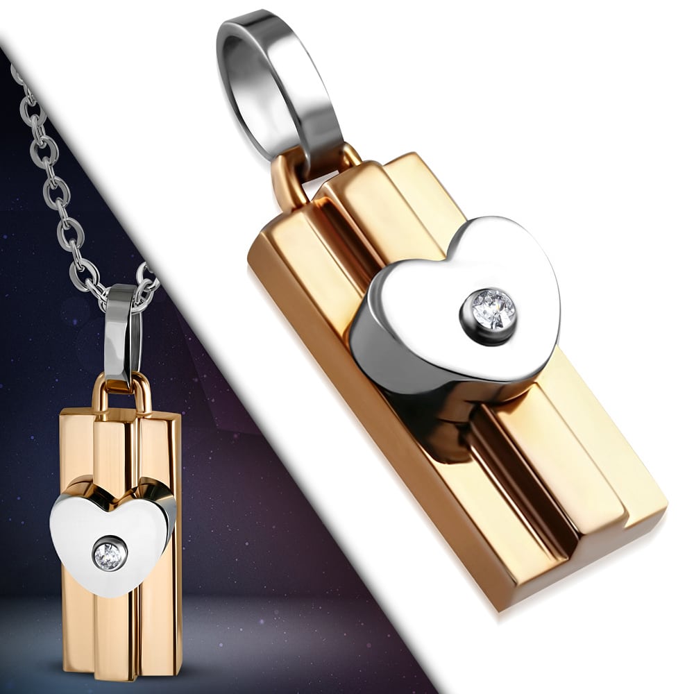 Arany és ezüst színű nemesacél medál, szív alakú, cirkónia kristályos dísszel