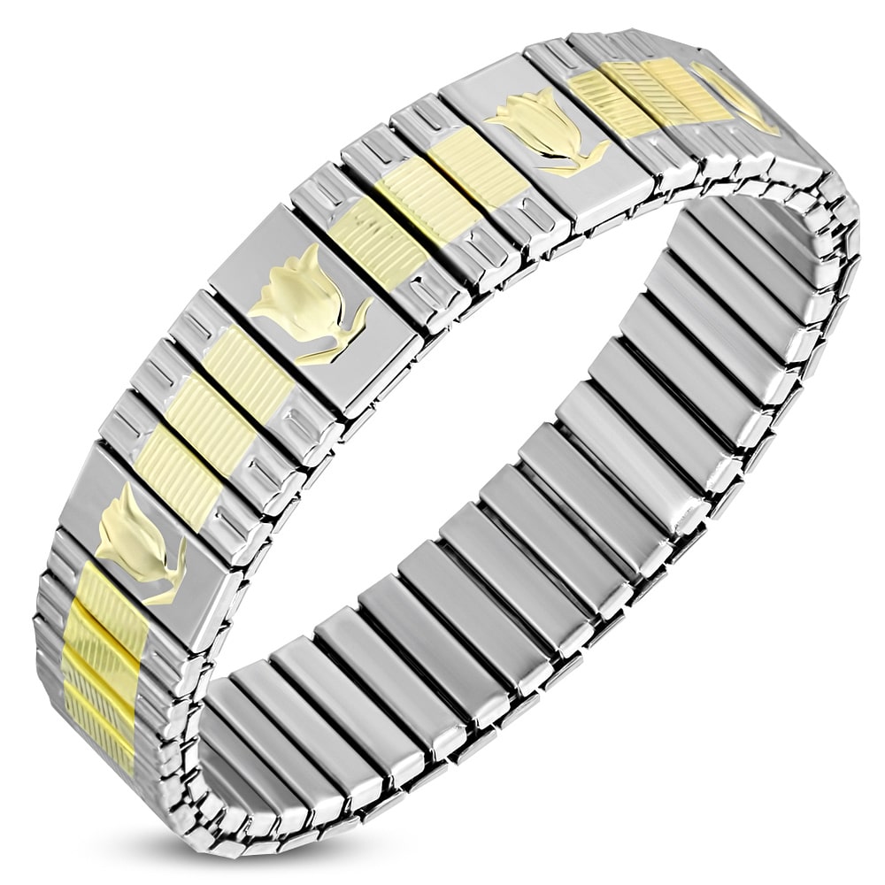Arany és ezüst színű, rugalmas nemesacél karlánc ékszer tulipán mintával