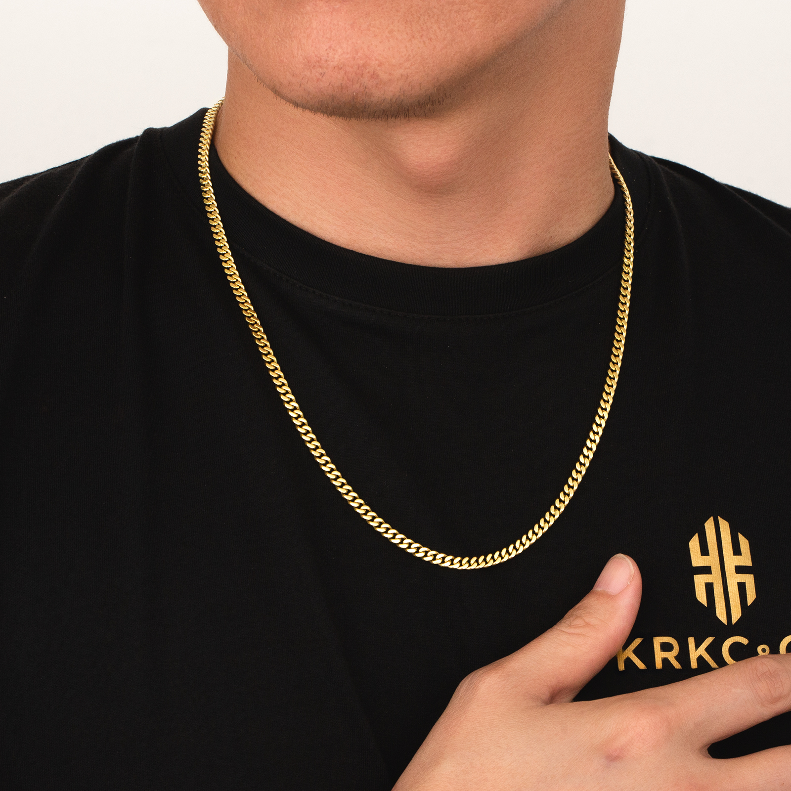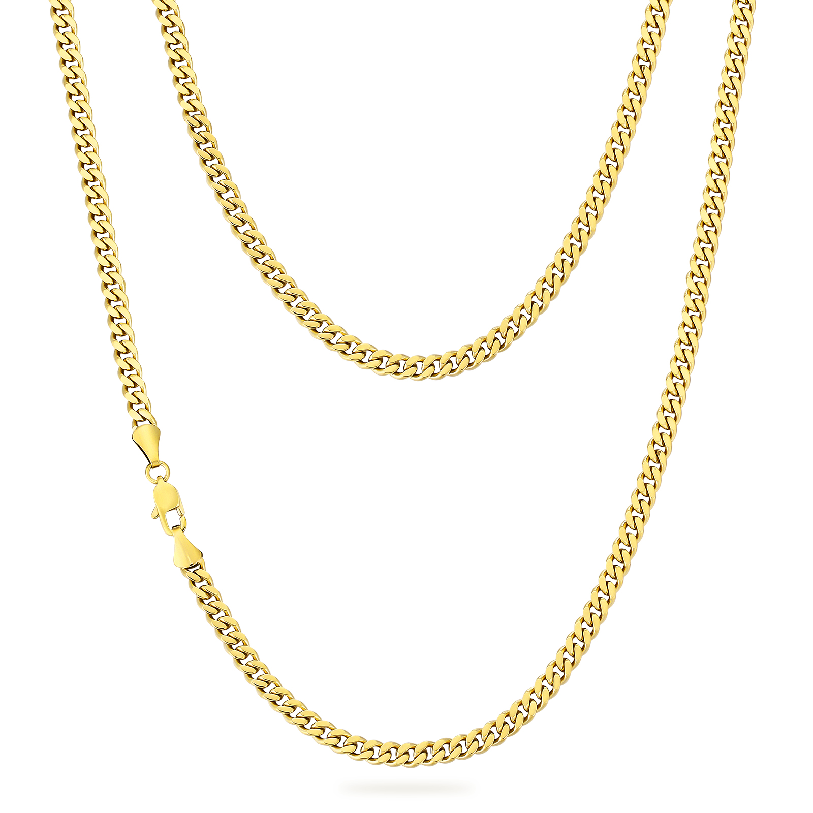 Arany színű kubai nemesacél nyaklánc – 4 mm vastag, amely polírozott rozsdamentes nemesacélból készült, prémium platinum bevonattal. A curb láncszemek szorosan illeszkednek egymáshoz, így letisztult, lapos és fényes felületet alkotnak, amely elegánsan simul a nyakhoz. Az arany árnyalat modern és visszafogott megjelenést biztosít. Nikkelmentes kialakításának köszönhetően érzékeny bőrön is kényelmesen viselhető, nem okoz allergiás reakciót.