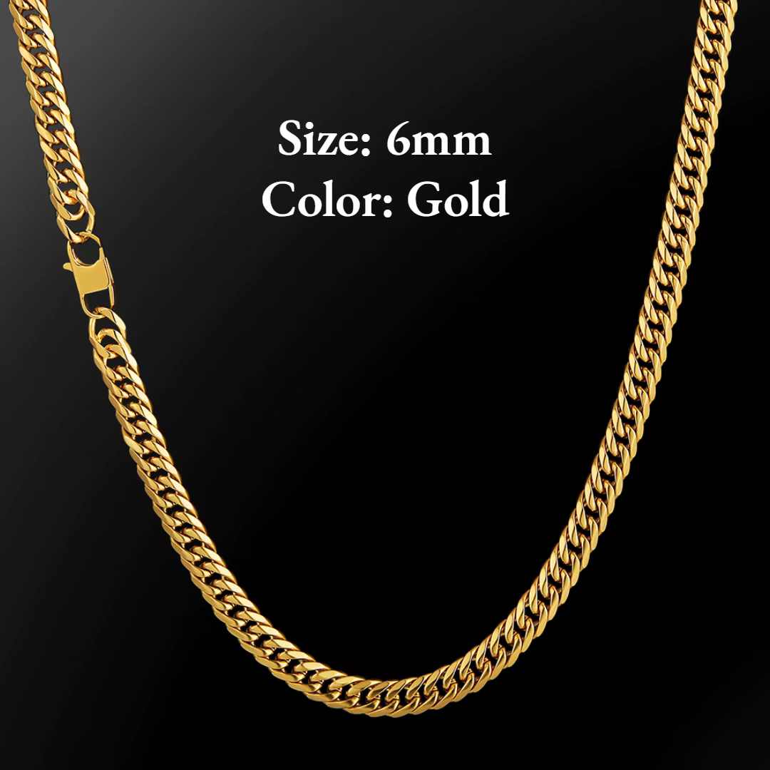 Arany színű kubai nemesacél nyaklánc – 6 mm vastag, amely polírozott rozsdamentes nemesacélból készült, curb-láncszem kialakítással és alacsony profilú, zárható kapoccsal. A lánc nikkelmentes, így kényelmes és irritációmentes viseletet biztosít, érzékenybőrűek bátran viselhetik. Hosszabb leírást lentebb találsz.