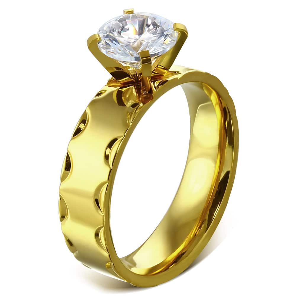Arany színű mintás nemesacél gyűrű cirkónia kristállyal.