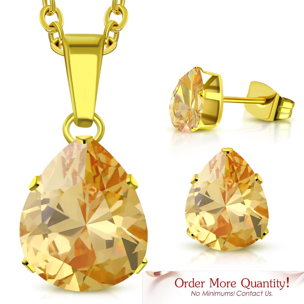 Arany színű nemesacél szett, nyaklánc, medál és fülbevaló, pezsgő színű cirkónia kristállyal