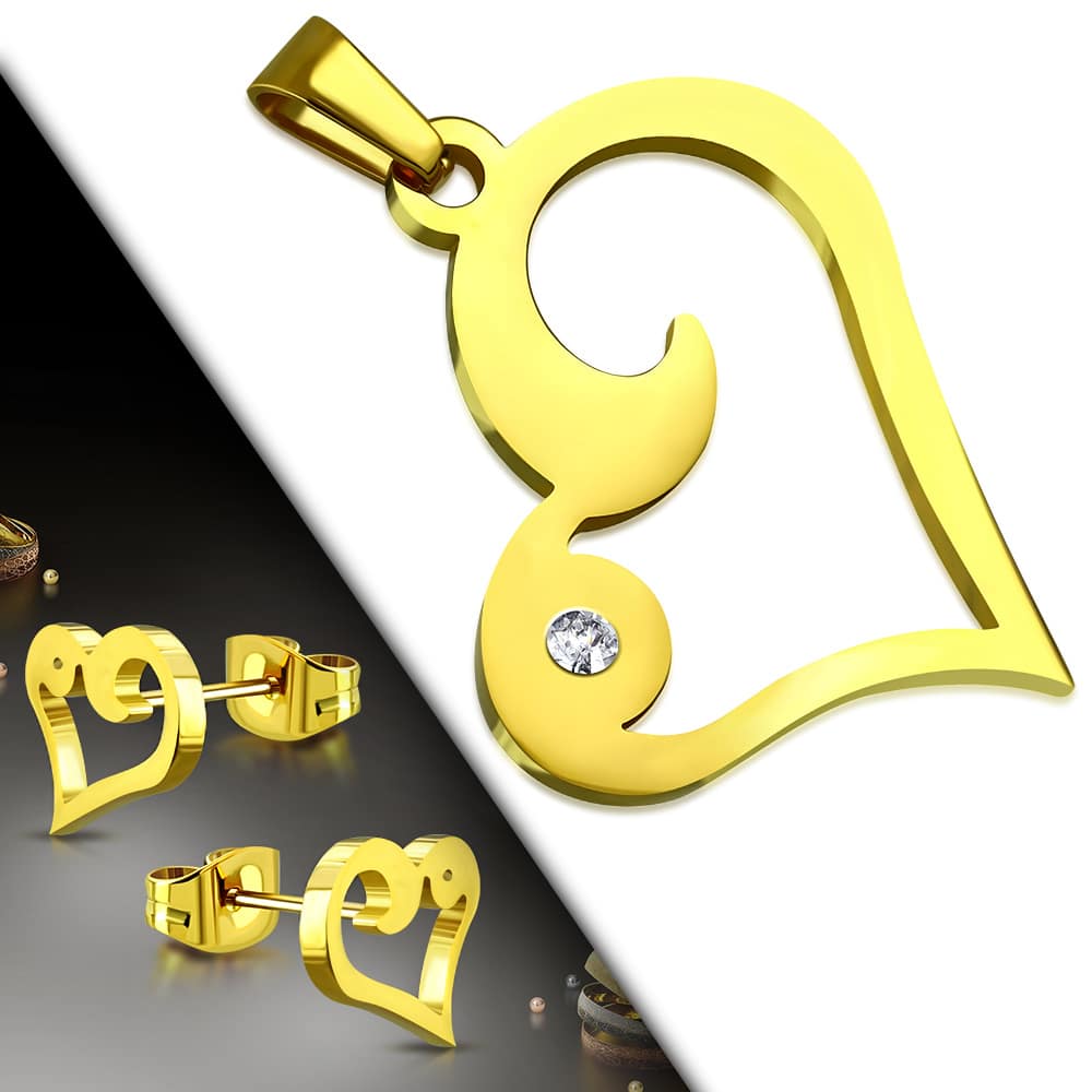 Arany színű nemesacél szett, szív alakú medál és fülbevaló, cirkónia kristállyal