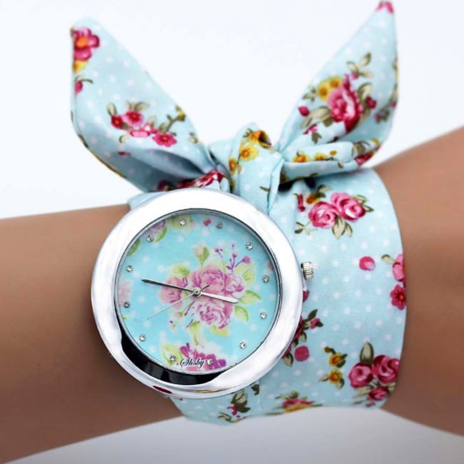 Divatos, nyárias karóra kék, virágos szövet szíjjal – nagyméretű számlappal