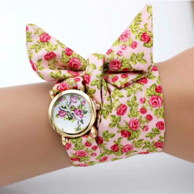 Divatos, nyárias karóra rózsaszín, virágos szövet szíjjal – közepes méretű számlappal