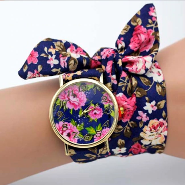 Divatos, nyárias karóra sötétkék, rózsaszín virágos szövet szíjjal – közepes méretű számlappal