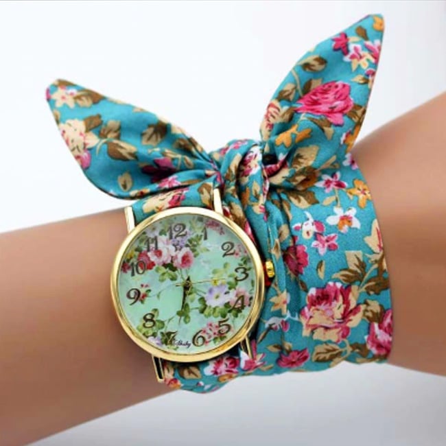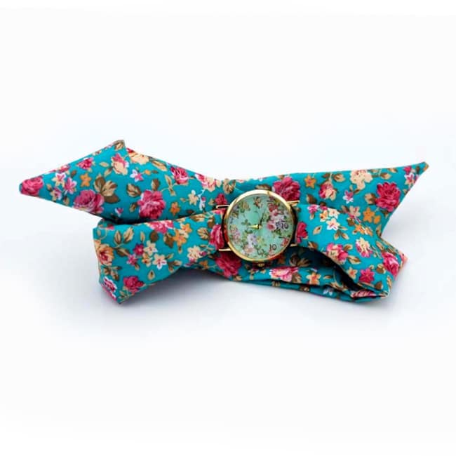 Divatos, nyárias karóra türkiz, rózsaszín virágos szövet szíjjal – közepes méretű számlappal