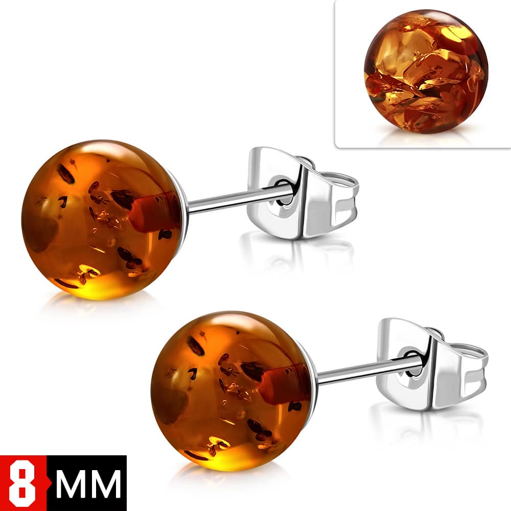 Nemesacél fülbevaló, gömb alakú borostyán színű gyönggyel