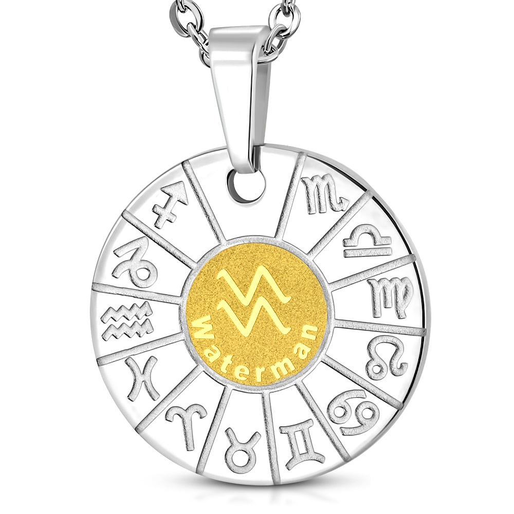 Ezüst és arany színű, kör alakú vízöntő horoszkóp nemesacél medál