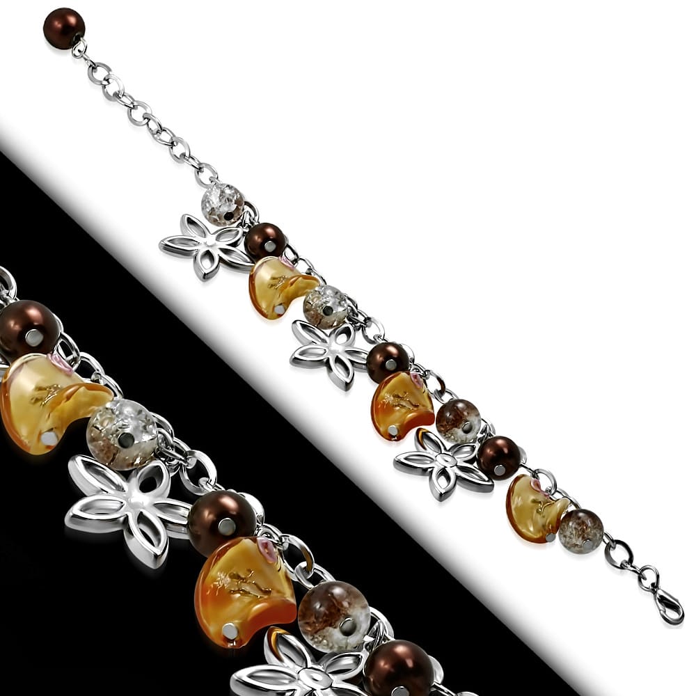 Ezüst színű karkötő barna színű üveggyöngy díszekkel