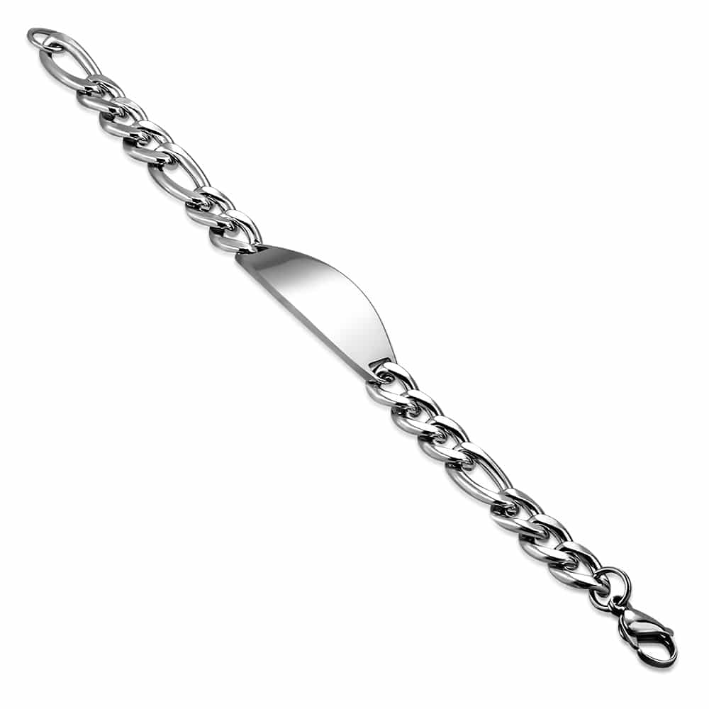 Ezüst színű nemesacél karkötő, lapos szemekkel, gravírozható dísszel férfiaknak és nőknek egyaránt nem csak hétköznapokra.