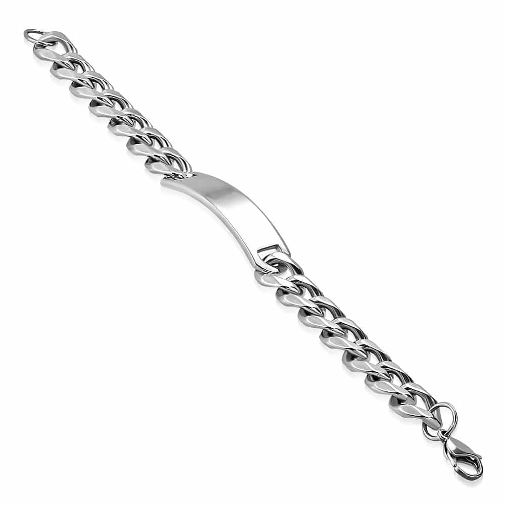 Ezüst színű nemesacél karkötő, lapos szemekkel, gravírozható dísszel férfiaknak és nőknek egyaránt nem csak hétköznapokra.