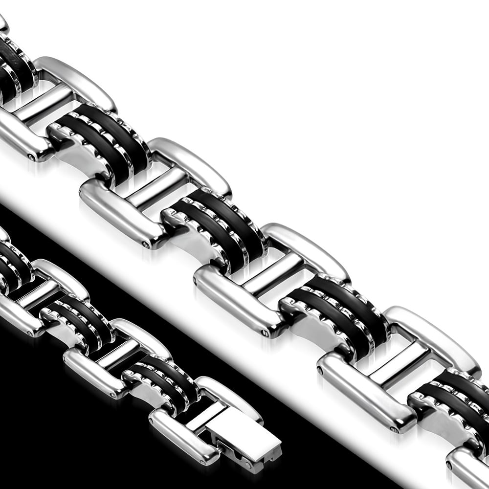 Ezüst színű nemesacél karlánc kaucsuk dísszel férfiaknak és nőknak egyaránt nem csak hétköznapokra.