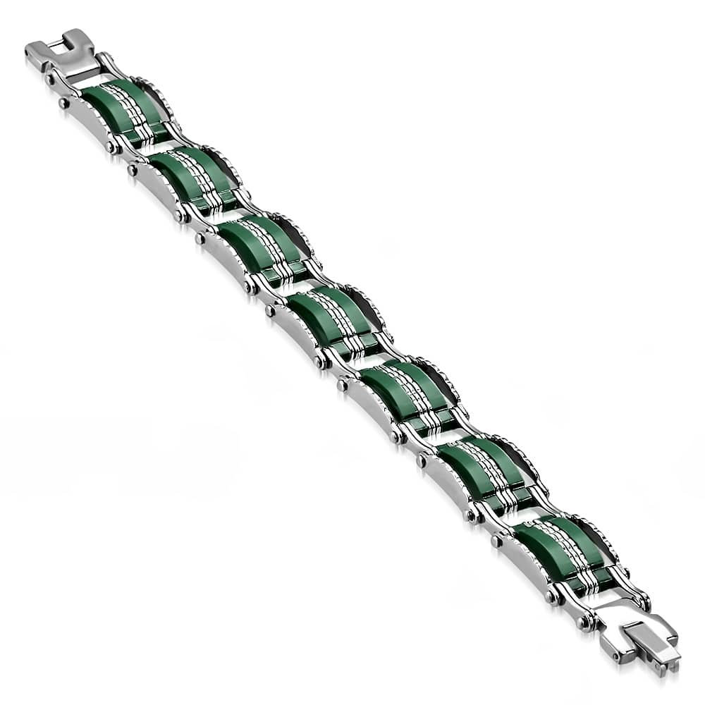 Ezüst színű nemesacél karlánc, zöld dísszel