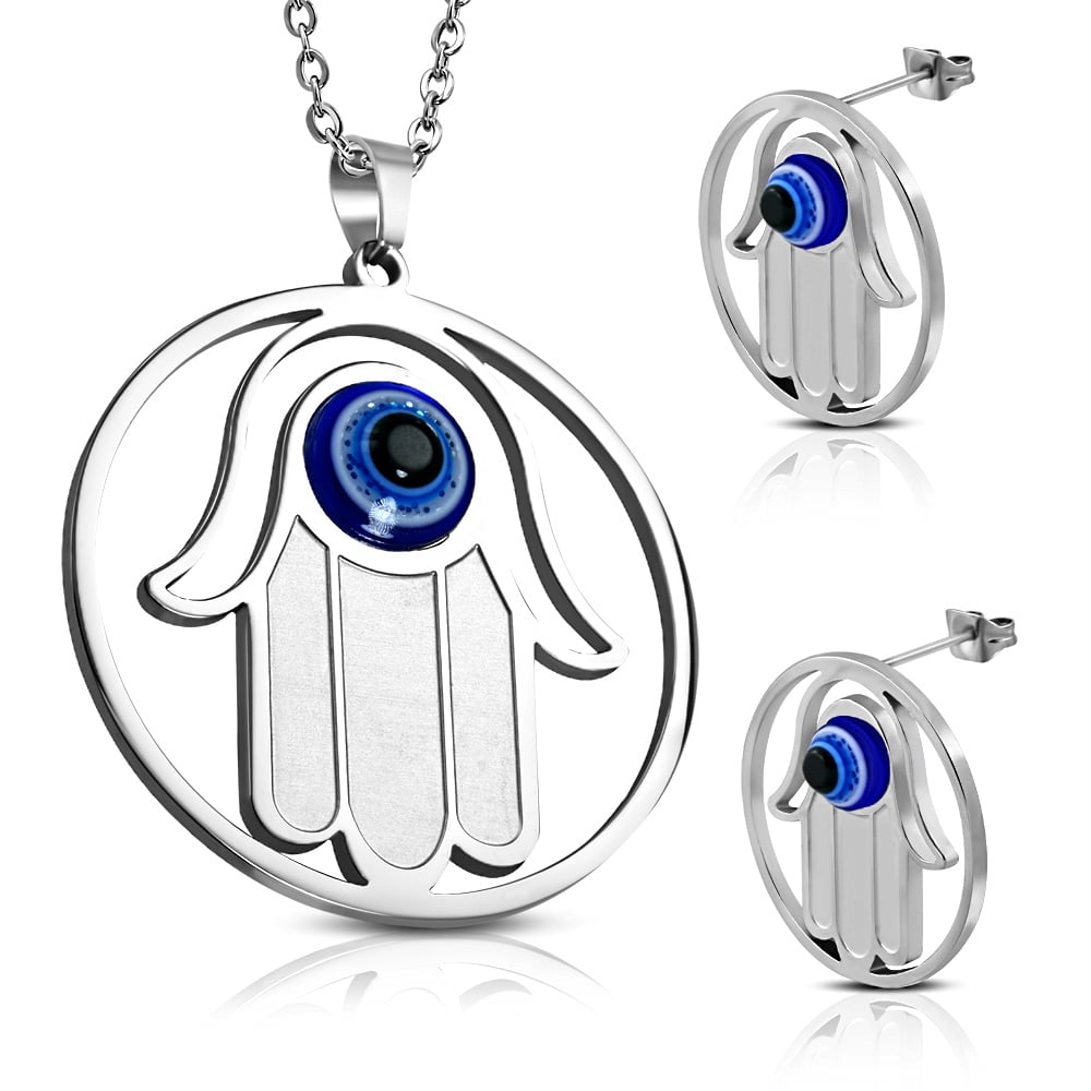 Ezüst színű nemesacél szett, kék szemű kéz formával, medál és fülbevaló