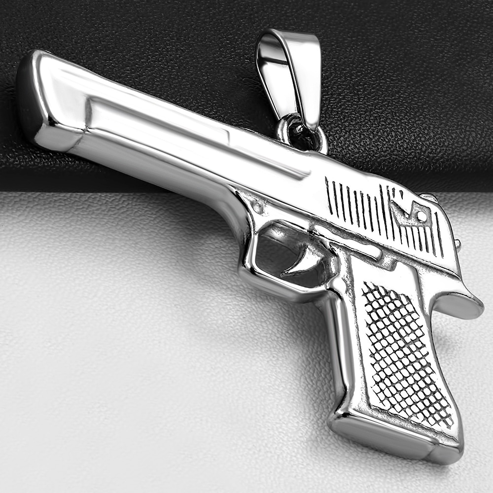 Ezüst színű, pisztolyalakú gravírozható nemesacél medál