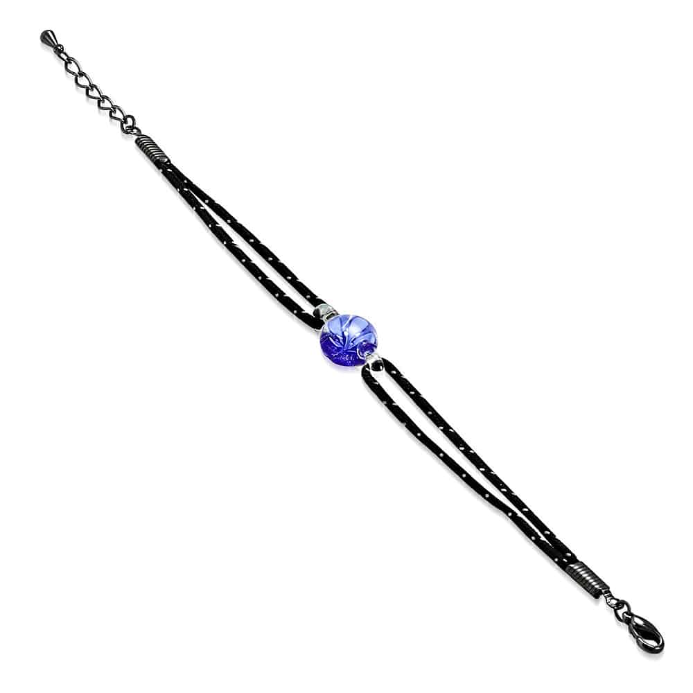 Fekete-fehér színű szövet karkötő, sötétkék virág mintás üveggyöngy dísszel