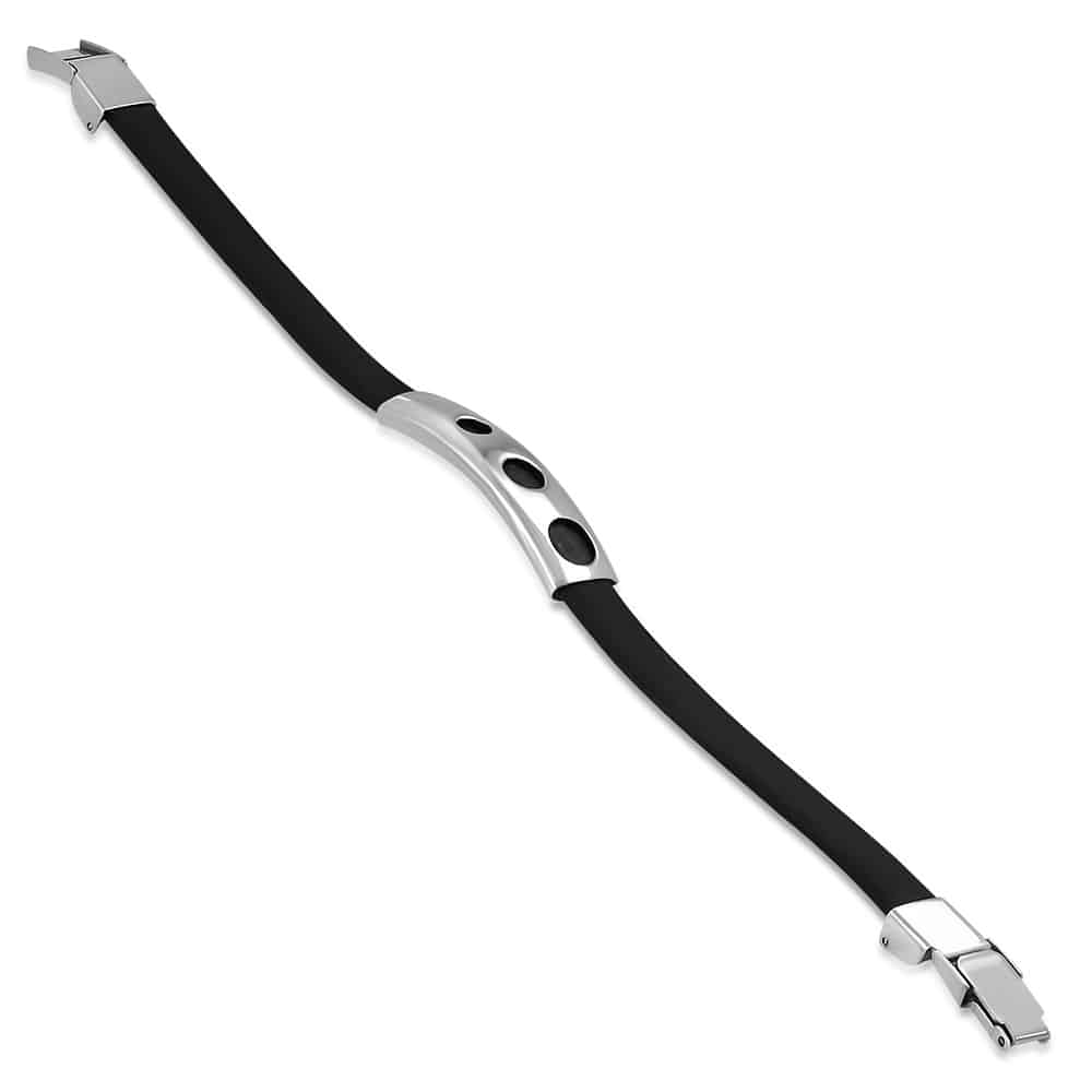 Fekete kaucsuk karkötő, ezüst színű nemesacél dísszel