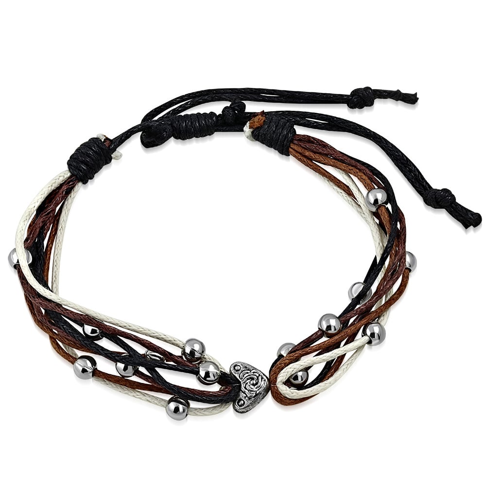 Állítható, divatos, fekete – barna -fehér színű, több szálas szövet karkötő szív alakú dísszel