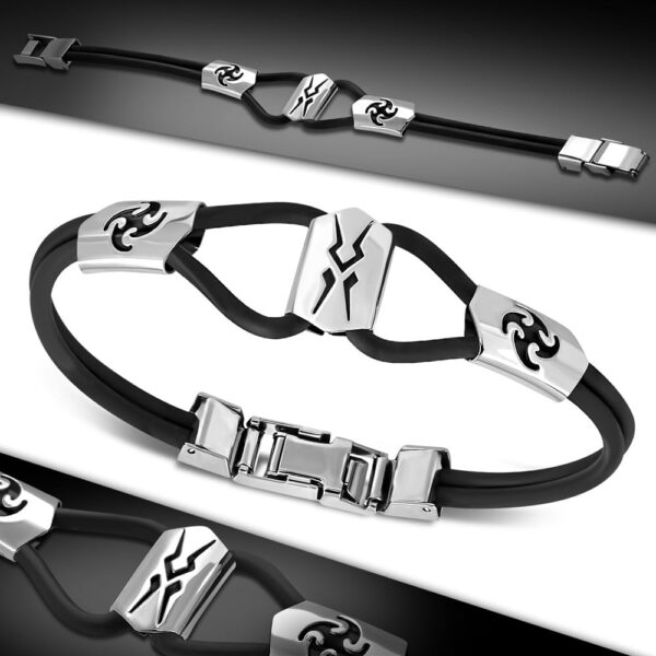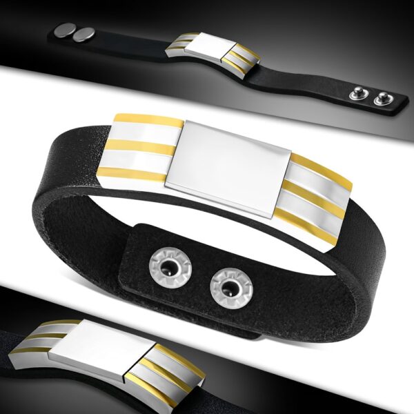 • Fekete kaucsuk karkötő, arany és ezüst színű nemesacél dísszelFekete kaucsuk karkötő, arany és ezüst színű nemesacél dísszel