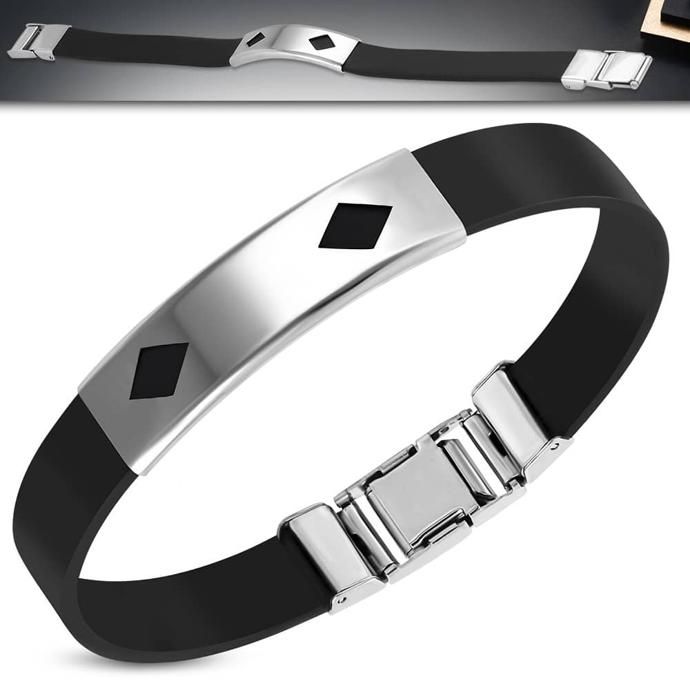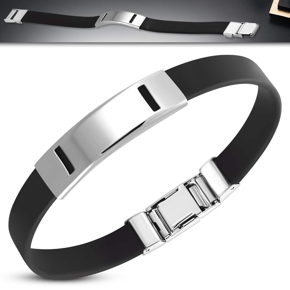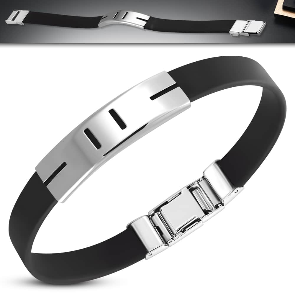 Fekete kaucsuk karkötő, ezüst színű nemesacél dísszel