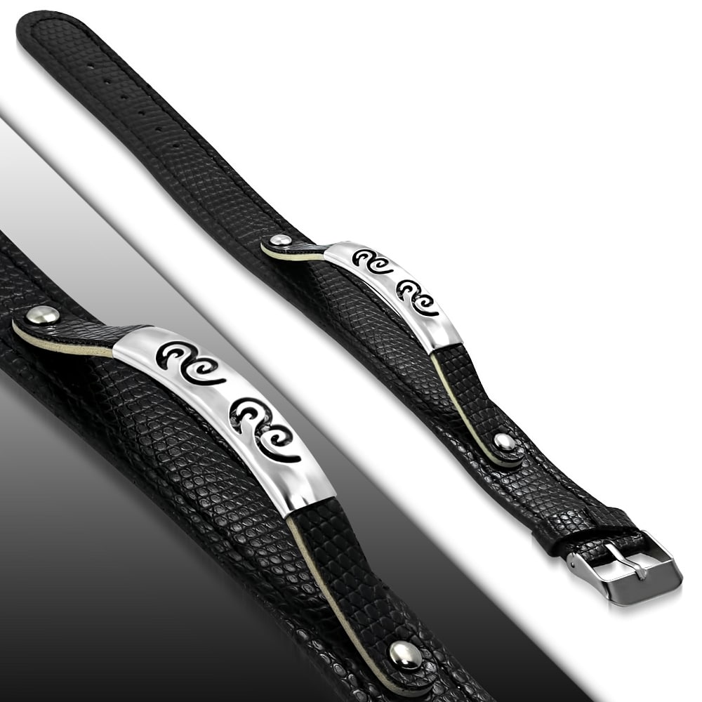 Fekete színű, huzal díszes fonott bőr karkötő nemesacél zárral