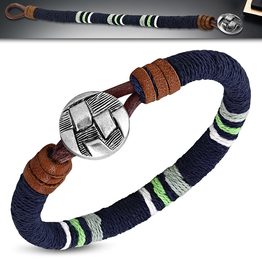 Színes szövet és bőr karkötő, gombos kapoccsal