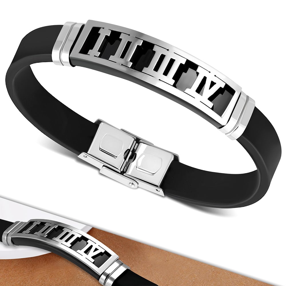 Fekete kaucsuk karkötő, ezüst színű, római számos nemesacél dísszel
