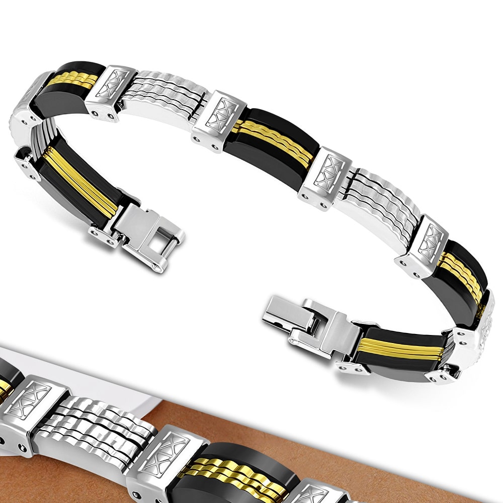 Ezüst és arany színű nemesacél karkötő kaucsuk dísszel
