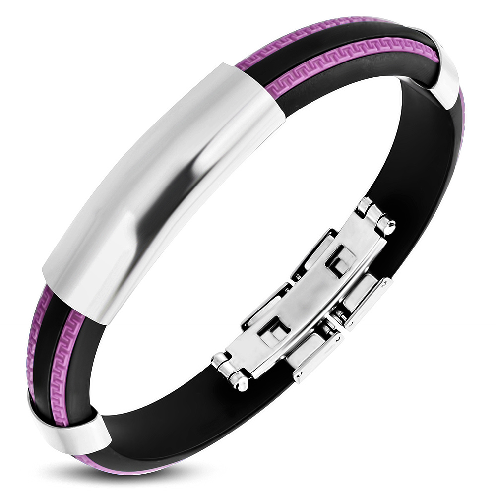 Lila színű kaucsuk karkötő, mintás nemesacél dísszel