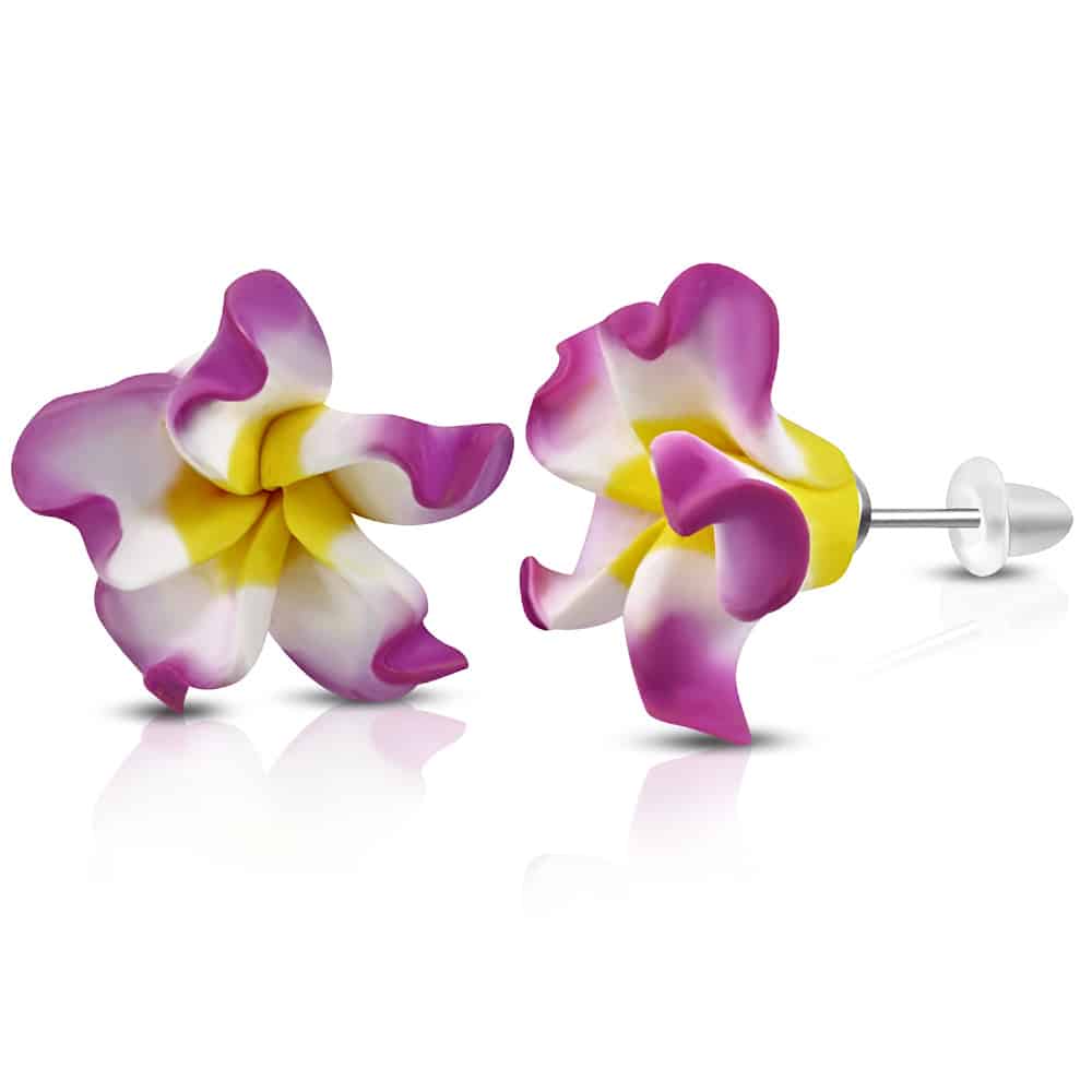 Lila-fehér-sárga pluméria virág fülbevaló