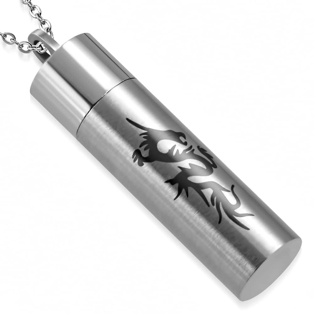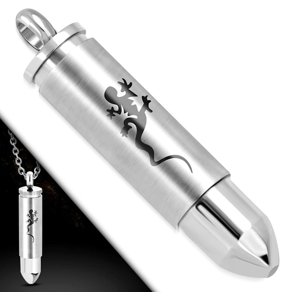 Ezüst színű, töltény alakú nemesacél medál gyík mintával