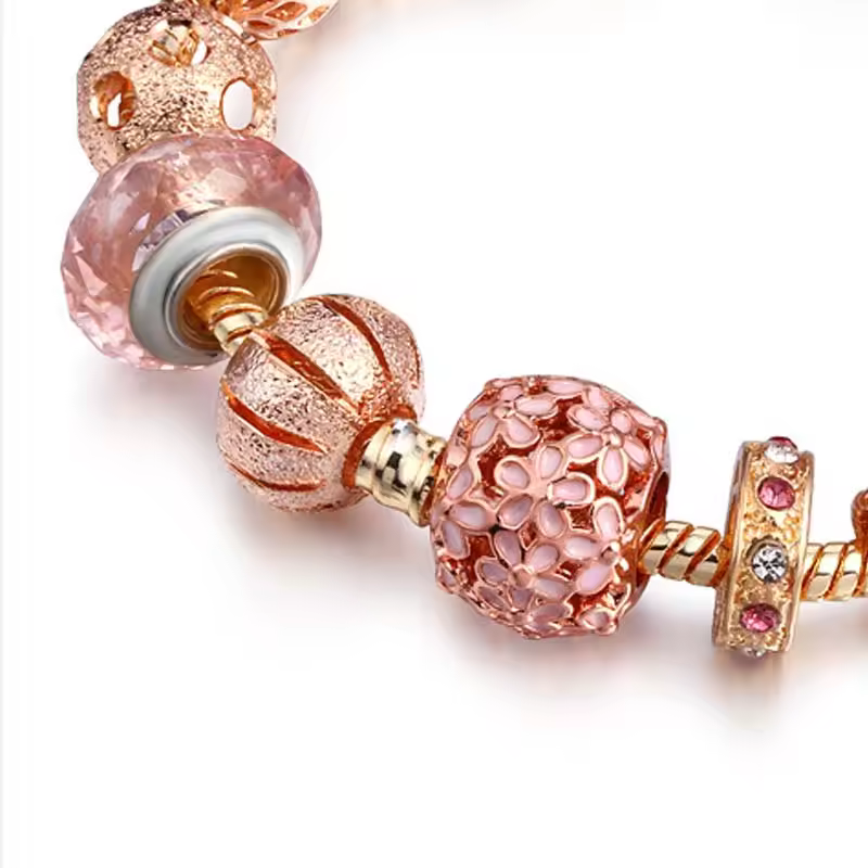 Pandora stílusú kristályos karkötő – Rózsa arany színben