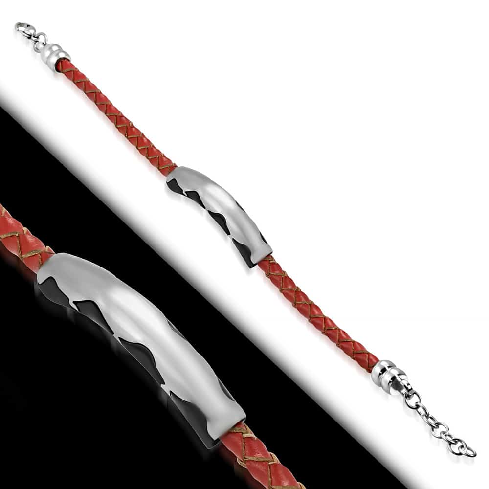 Piros bőr karkötő, fekete – ezüst színű nemesacél dísszel