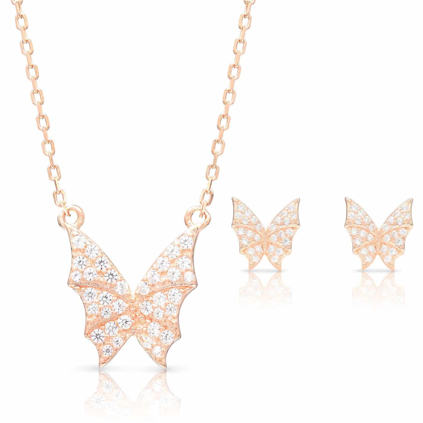 Varázsold el a környezetedet ezzel a gyönyörű, ródiumozott, rózsaarany bevonatú pillangós cirkónia kristályos ékszerszettel, amely minden szettet tökéletesen kiegészít! ✨