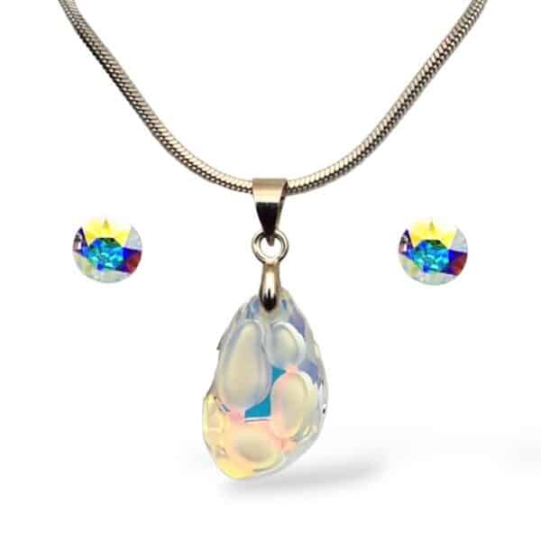 Egyedi, kézzel készített swarovski kristályos ékszer szett, amely egy 18 mm-es “buborék” alakú swarovski kristállyal készült medálból és egy pár 6 mm átmérőjű swarovski kristállyal készült pont fülbevalóból áll. A fülbevaló és a nyaklánc alapanyaga nikkelmentes ötvözet. Az ékszerszett kizárólag, erdeti és igazolt swarovski elements kristály felhasználásával készült, amely garantálja a hosszan tartó gyönyörű csillogást. A swarovski elements kristályok egy különleges eljárásnak köszönhetően páratlan, egy gyémánttal egyenértékű csillogást biztosítanak viselőjük számára.