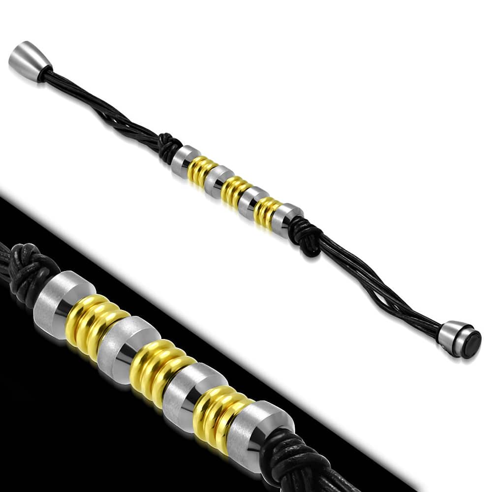 Fekete fonott bőrkarkötő, arany és ezüst színű nemesacél dísszel