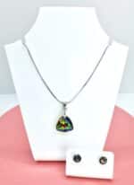 Fedezd fel a gyönyörű, kézzel készített swarovski kristályos nemesacél ékszer szettet, mely egy ezüst színű nemesacél nyakláncot rejt egy csillogó 16 mm-es trilliant swarovski kristályos medállal és egy pár 6 mm átmérőjű swarovski kristályos fülbevalót. Díszdoboz jár hozzá ajándékba.