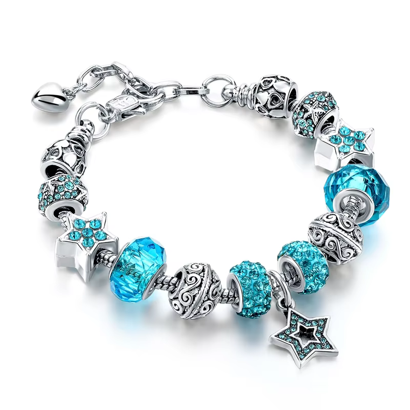 Türkiz Pandora stílusú kristályos karkötő – Csillag medállal