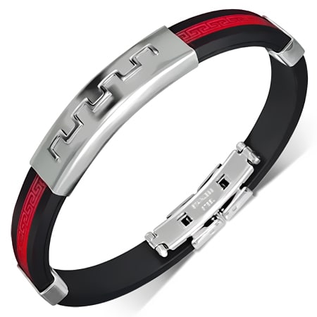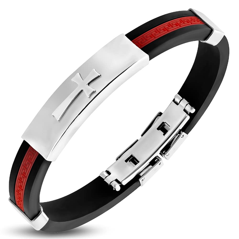Fekete kaucsuk karkötő ezüst színű keresztes nemesacél dísszel, piros görög mintás betéttel