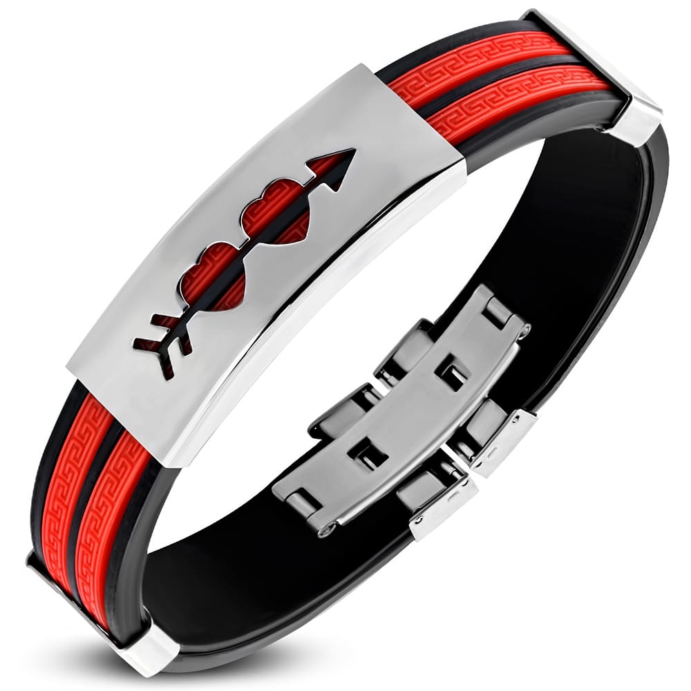 Fekete – piros kaucsuk karkötő, szív mintás nemesacél dísszel