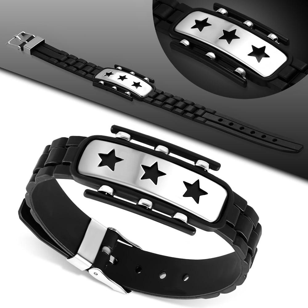 Fekete színű kaucsuk karkötő, csillag mintás nemesacél dísszel