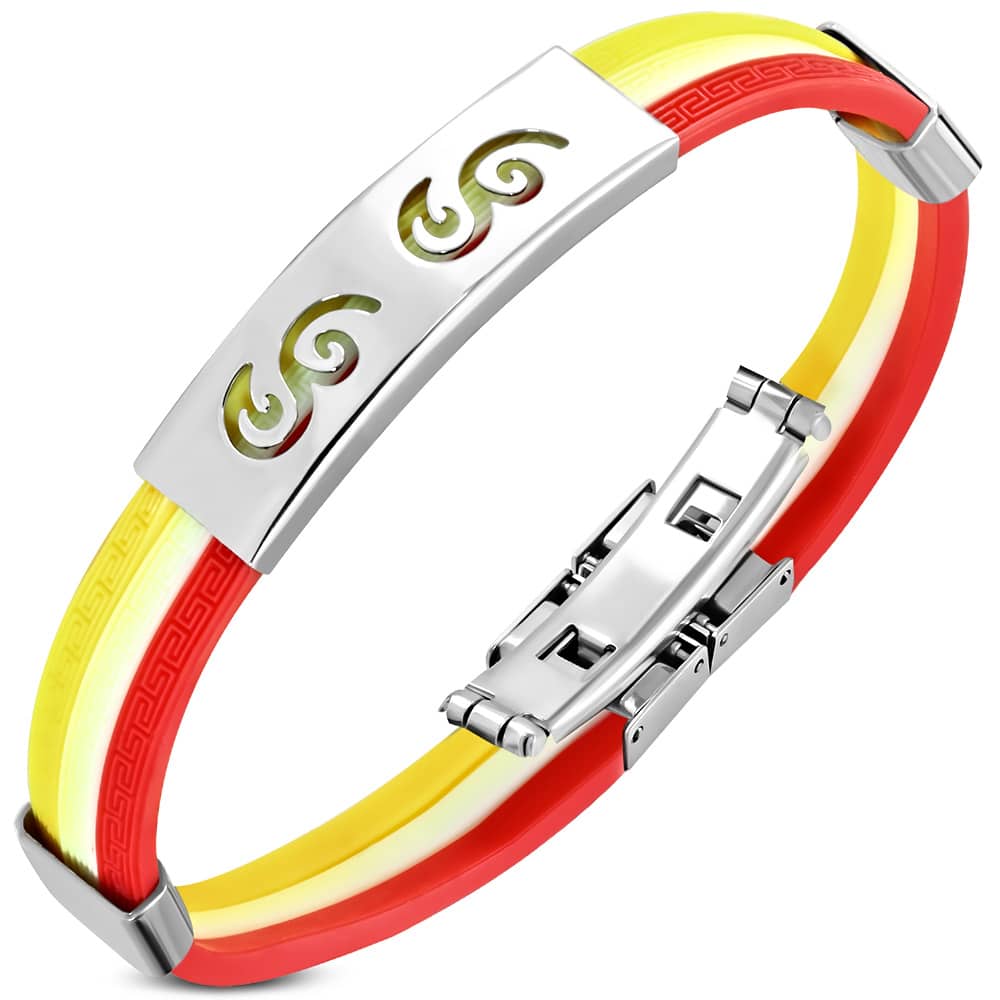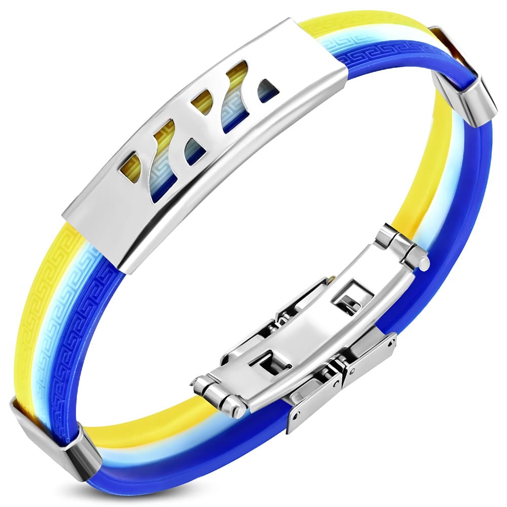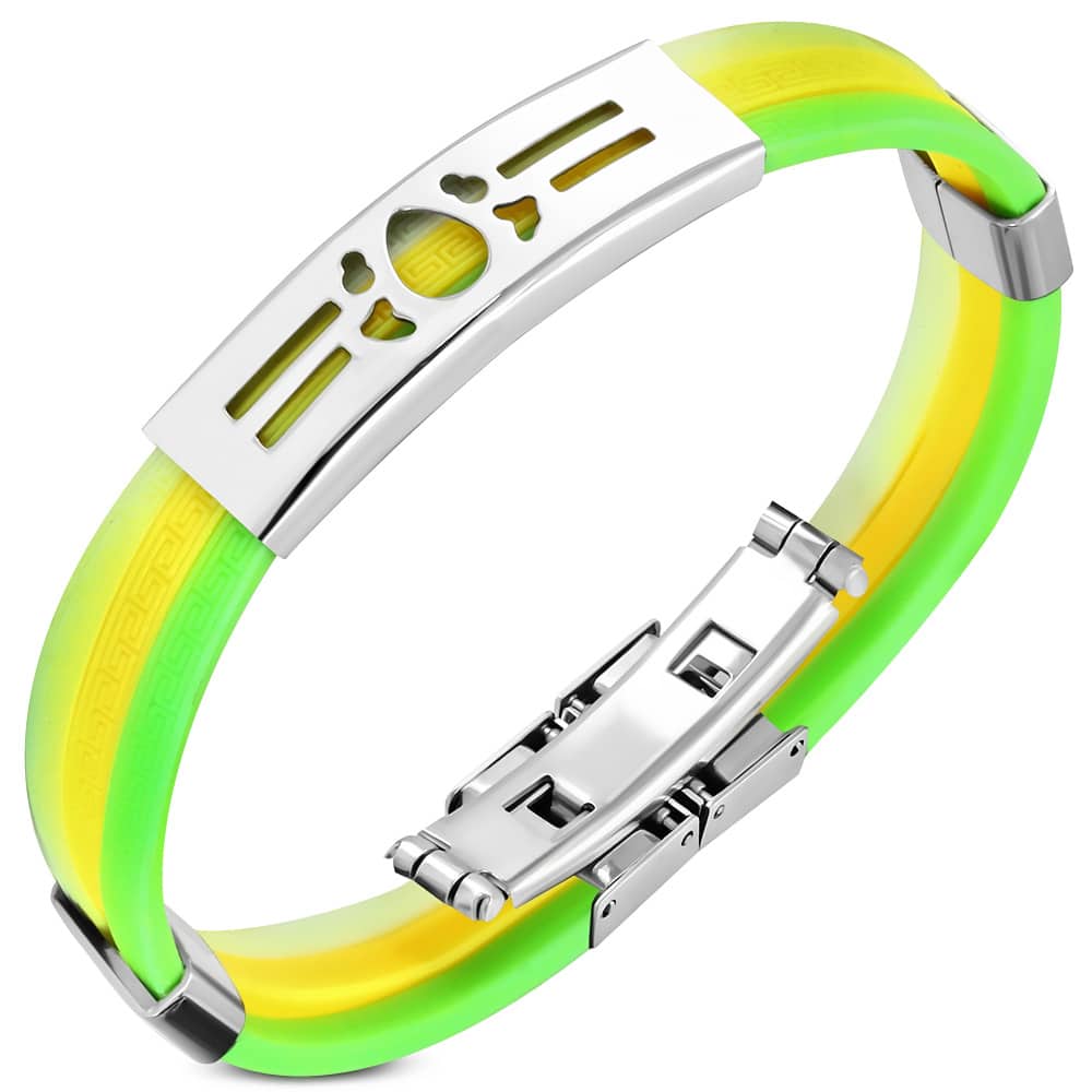 Zöld színű kaucsuk karkötő, görög mintás nemesacél dísszel