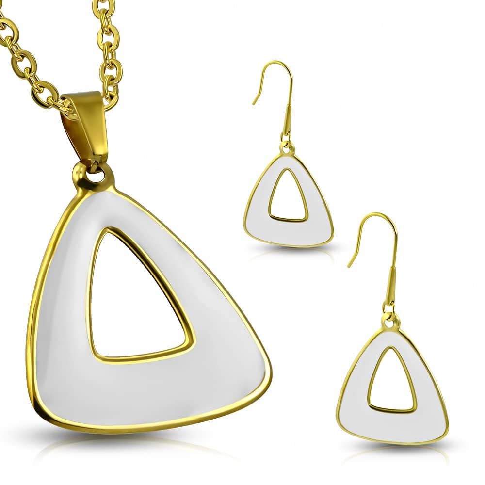 Zománcozott, arany színű nemesacél szett, háromszög alakú medállal és fülbevalóval